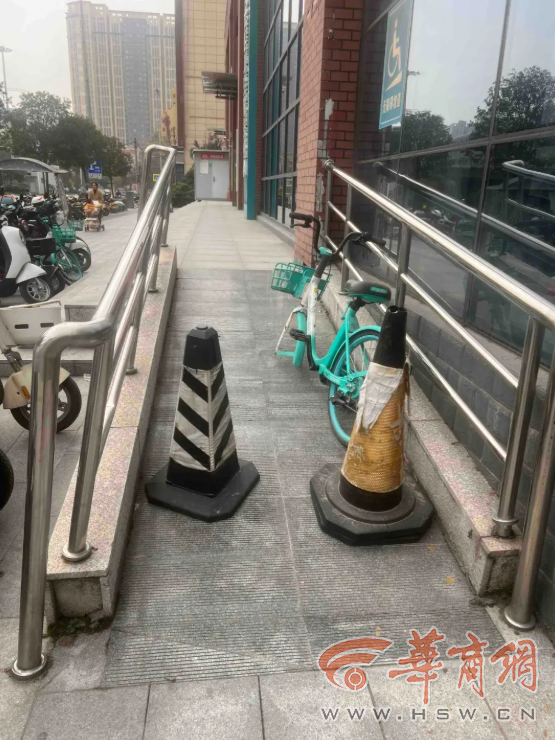 不过,中心除药房窗口张贴了“老年人优先”提示,缴费等其他窗口的相关提醒不够完善。11月14日上午,中心大门口的无障碍通道被2个路障和1辆共享单车拦截,影响特殊群体通行。
