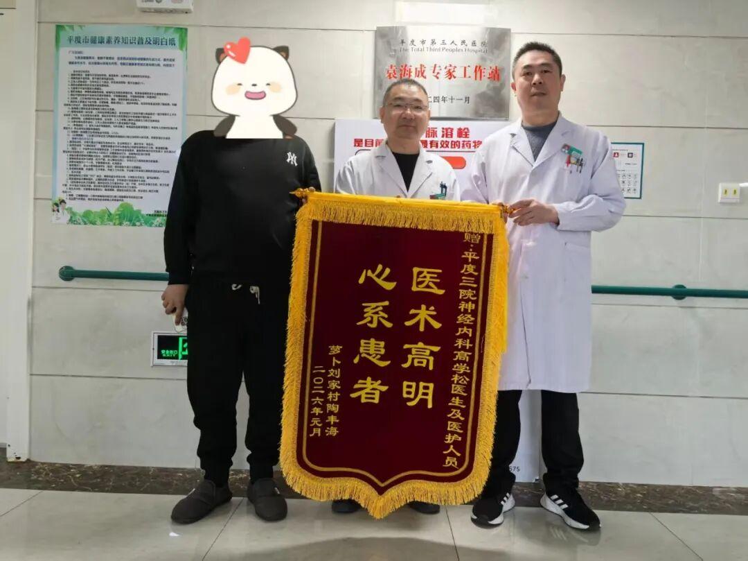 鲁网2月6日讯近日,平度市第三人民医院神经内科副主任医师高学松收到了一份特殊的“礼物”——一面写有“医术高明,心系患者”的鲜红锦旗。送旗的陶大爷儿子紧握高学松医生的手,连声道谢:“要不是您当时果断决定,我们真不知道现在会怎么样,是您给了我父亲第二次生命。”