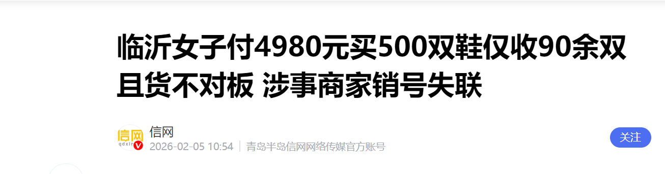 信网·信号新闻2月5日讯近日,山东临沂的刘女士向信号新闻(0532-80889431)反映,她在短视频平台上被商家销售低价鞋的广告吸引,私信后商家要求使用微信沟通。经过一番交流,刘女士以不到10元一双的价格支付了500双“精品女鞋”的货款。等她收货时,发现鞋的数量仅有90多双,且货不对板。刘女士再与商家联系时,发现已遭对方拉黑。