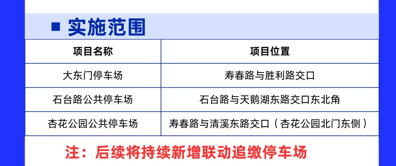 本规则自2026年3月25日起正式执行。先在大东门停车场、石台路公共停车场、杏花公园公共停车场实施,后续将持续新增联动追缴停车场。合肥城泊公司已在上述停车场进出口通道,道闸等显著位置设置提示标识。车辆在上述停车场离场时,系统将自动核查路内欠费情况。如存在欠费,车主需补缴至少3笔欠费后方可离场。