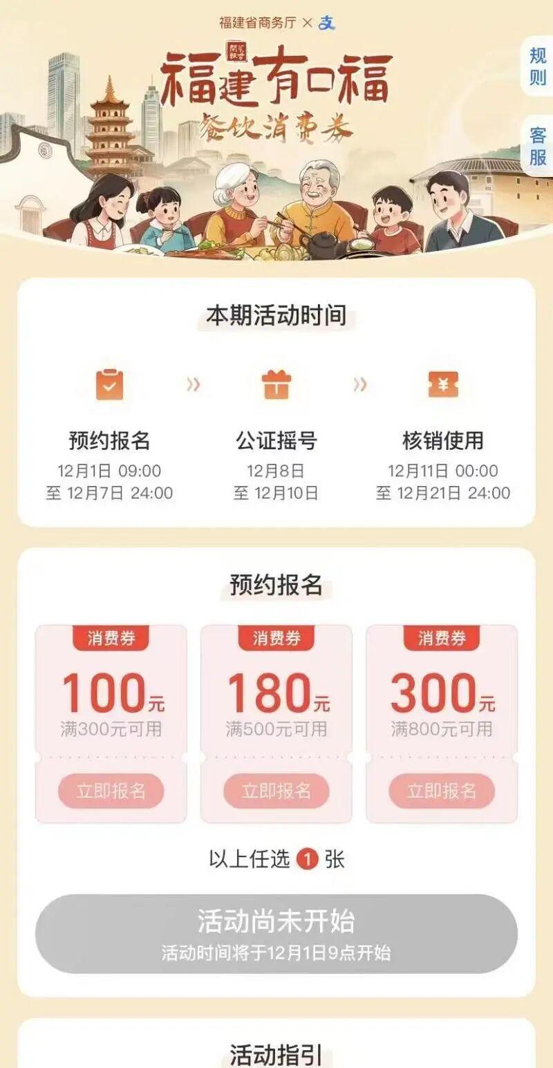 活动共分三轮进行,发放对象为位置信息定位在福建省的消费者,包括本省居民以及来福建省旅游、出差等人员,均可报名申领消费券,本轮消费券分为满300元减100元、满500元减180元、满800元减300元三档券面,以满足消费者的多样化需求。
