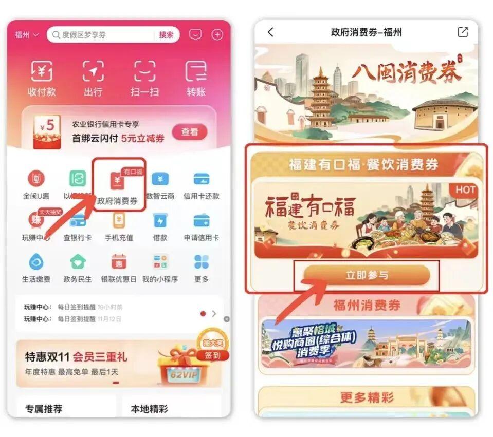 银联云闪付:在云闪付App主页点击(搜索)“福建有口福”或“政府消费券”标签进入“福建有口福”活动页面;