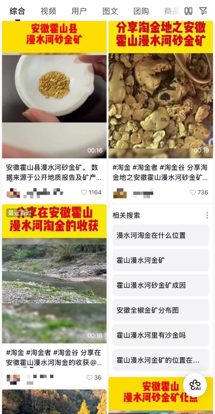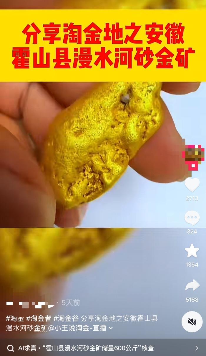 大皖新闻讯 近日,多个社交账号在抖音平台发布视频,称在安徽霍山县漫水河镇“淘金”引发广泛关注。视频中言之凿凿地表示,漫水河流域拥有砂金矿,属于冲积型砂金矿,沿河分布,赋存于第四系全新统河漫滩砂砾石层中,砂层厚度1至4米,预估储量约600公斤。评论区里,不少网民纷纷留言调侃“组团去淘金”,也有网友质疑视频的真实性。