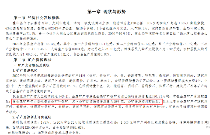 针对网传信息,大皖新闻记者查询了霍山县政府官网发布的《霍山县矿产资源总体规划(2021—2025年)》。规划明确显示,霍山县贵金属矿产仅有小型规模的金矿和银矿,其中金矿目前保有资源量为29千克,金矿资源相对较缺乏。