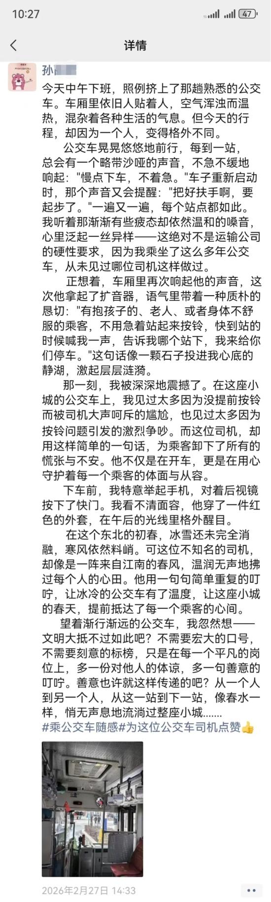 近日,临江市的孙女士在自己的微信朋友圈发布了一段长文,表示自己很感动、很温暖,想通过文字来表达自己的乘坐公交车的感受,原文如下——