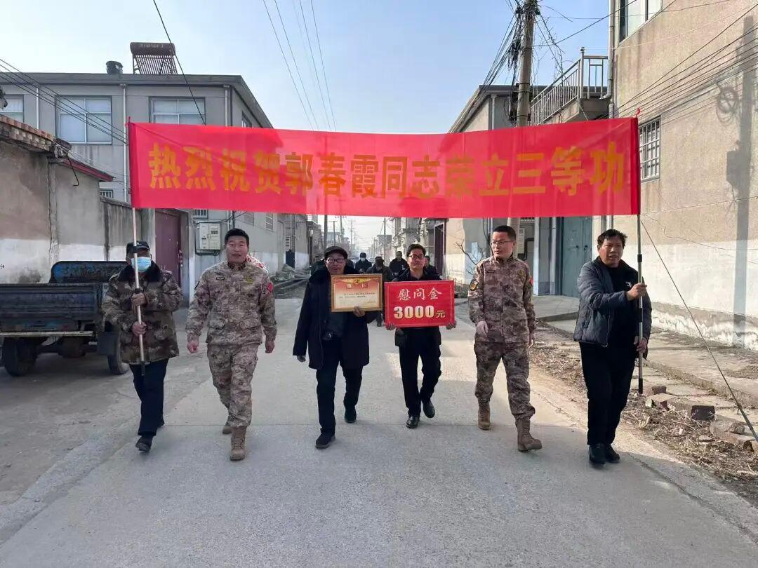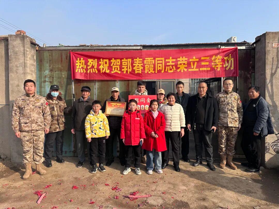 在军属家门前,喜庆的氛围格外浓厚。武装部部长郑重地将金光闪闪的三等功喜报和承载着关怀的慰问金交到郭春霞同志母亲手中,“恭喜你们培养出这么出色的女儿!她在部队建功立业,展现了我们相公街道子弟兵的优秀风采,特别是作为一名女兵,这份荣誉更是难能可贵,是真正的巾帼不让须眉!”部长向军属表达了崇高的敬意和热烈的祝贺。