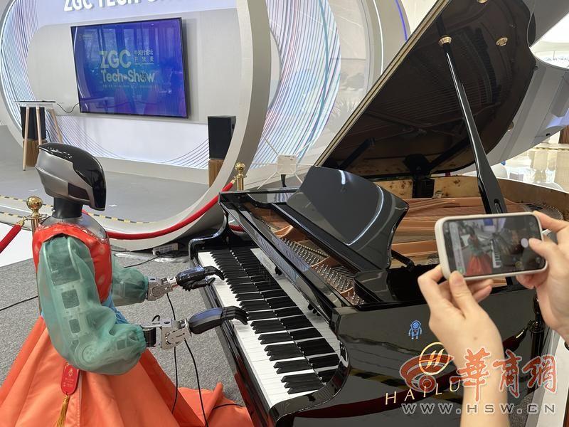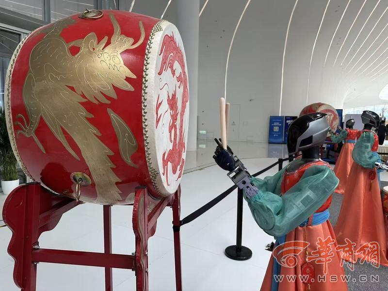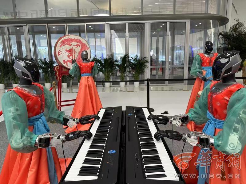 大门口,有机器人迎宾。进入会场,有机器人进行才艺展示。不远处音乐响起,吸引了大家关注。原来,机器人乐队已经准备就位,有序配合,进行敲击和弹奏。