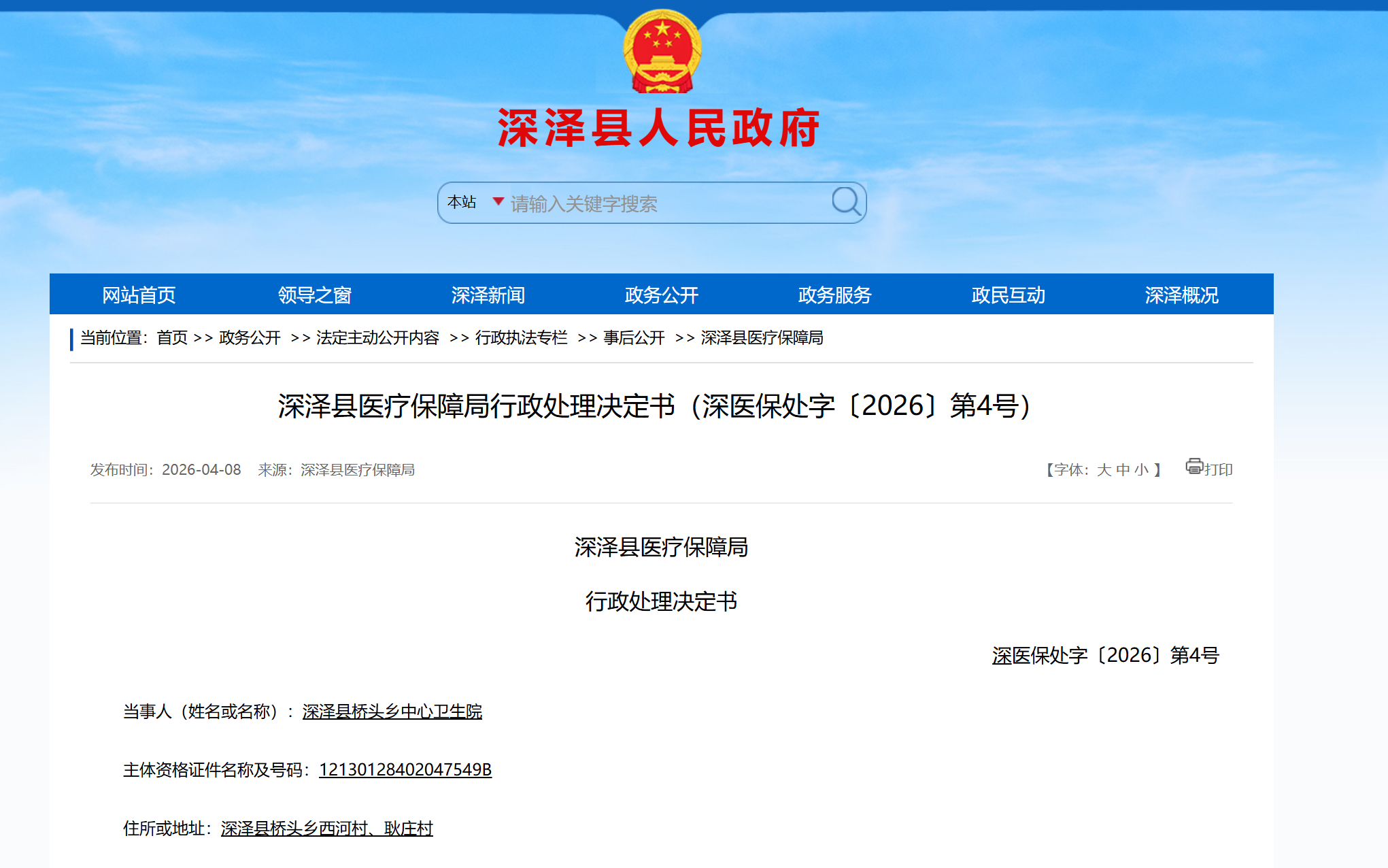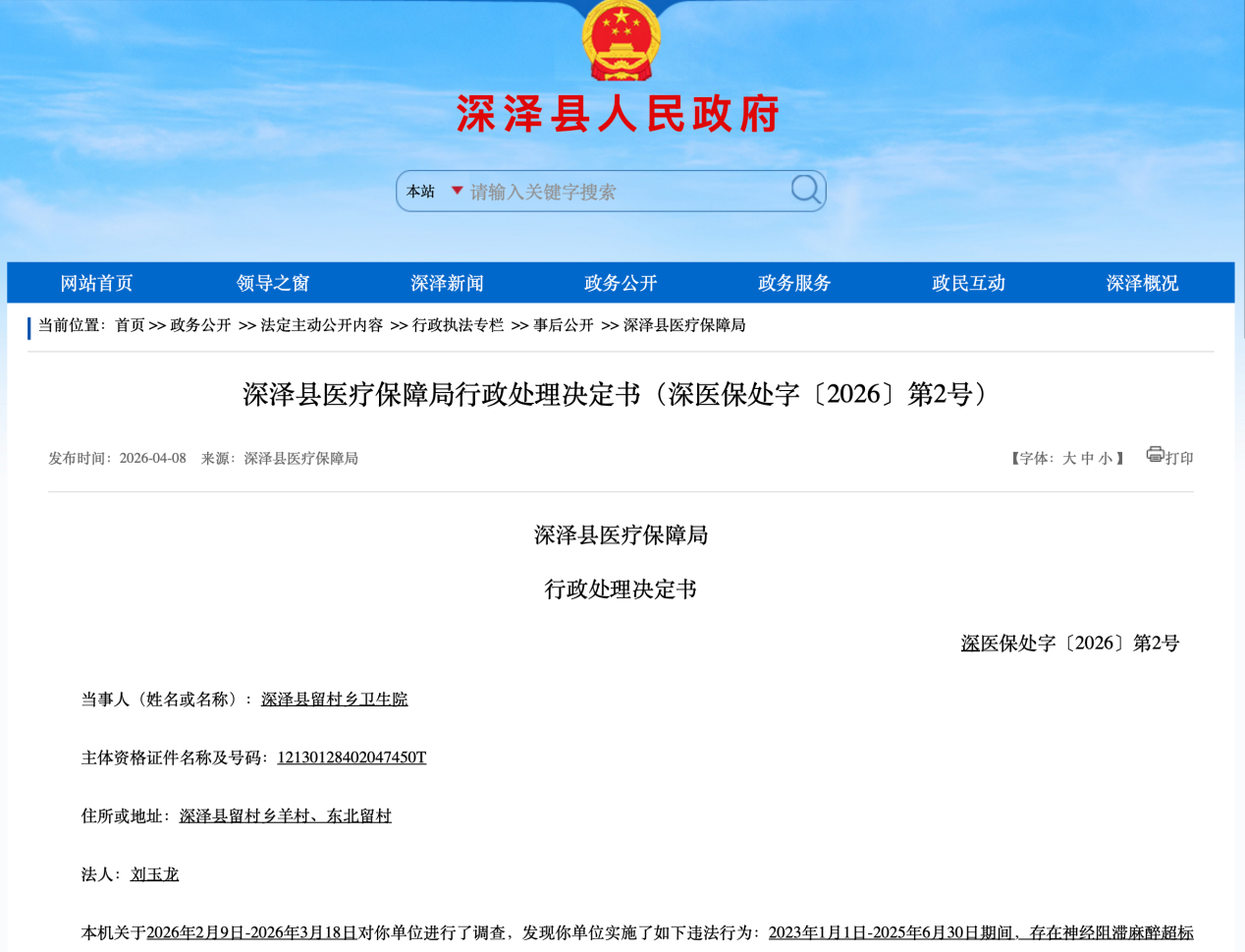 深泽县医疗保障局于2026年4月8日发布了两份行政处理决定书,深泽县留村乡卫生院、深泽县桥头乡中心卫生院因将不属于医保支付范围的医药费用纳入结算、重复收费、超限用药等问题,造成医保基金损失,被深泽县医疗保障局责令退回损失并处同等金额的罚款。