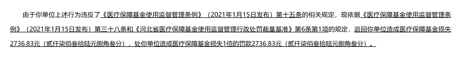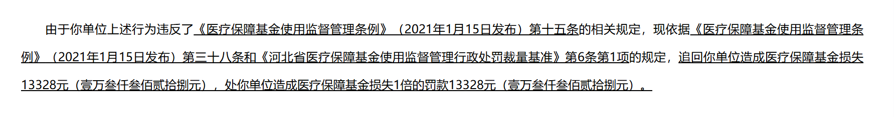 深泽县桥头乡中心卫生院因初次违法,危害后果轻微,立行立改违法行为并主动退回医保基金,同样从轻、减轻处罚:追回医保基金损失13328元,并处损失1倍的罚款13328元。