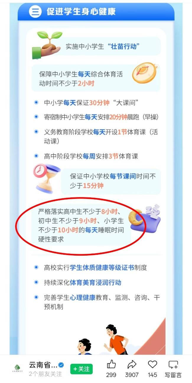 大皖新闻记者注意到,2025年1月,云南省教育厅官方微信公众号发文称,当地有关部门印发了《关于进一步全面深化教育综合改革的若干措施》,提出18条改革措施。明确提到要严格落实高中生不少于8小时、 初中生不少于9小时、小学生不少于10小时的每天睡眠时间硬性要求。同时提及,义务教育非寄宿制学校不得统一安排晚自习。