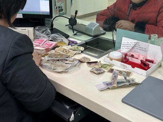 周四上午,一位穿着红色外套的阿姨提着一个塑料袋走进营业厅,袋里的声响引起了大堂经理的注意。打开袋子,里面是一沓沓用橡皮筋捆扎的纸币,有被反复折叠的一角、五角,也有带着岁月痕迹的旧版人民币,还有不少因受潮而粘连在一起的残币。“这些都是平时卖菜、卖废品攒的零钱,放家里怕潮,想存进银行,就是太乱了,怕给你们添麻烦。”阿姨的语气里带着几分局促。
