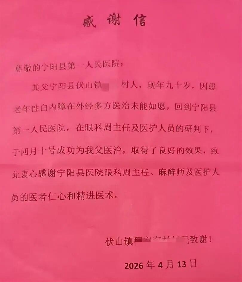 鲁网4月16日讯近日,泰安市宁阳县第一人民医院眼科收到了一封来自伏山镇村民的感谢信。信中提到,老人今年已90岁高龄,因患老年性白内障,在外辗转多方医治都未能如愿,最终回到宁阳县第一人民医院就诊。在眼科周主任及全体医护人员的精准研判、精心诊疗下,于4月10日完成手术,术后恢复效果良好,家属的感激之情溢于言表。