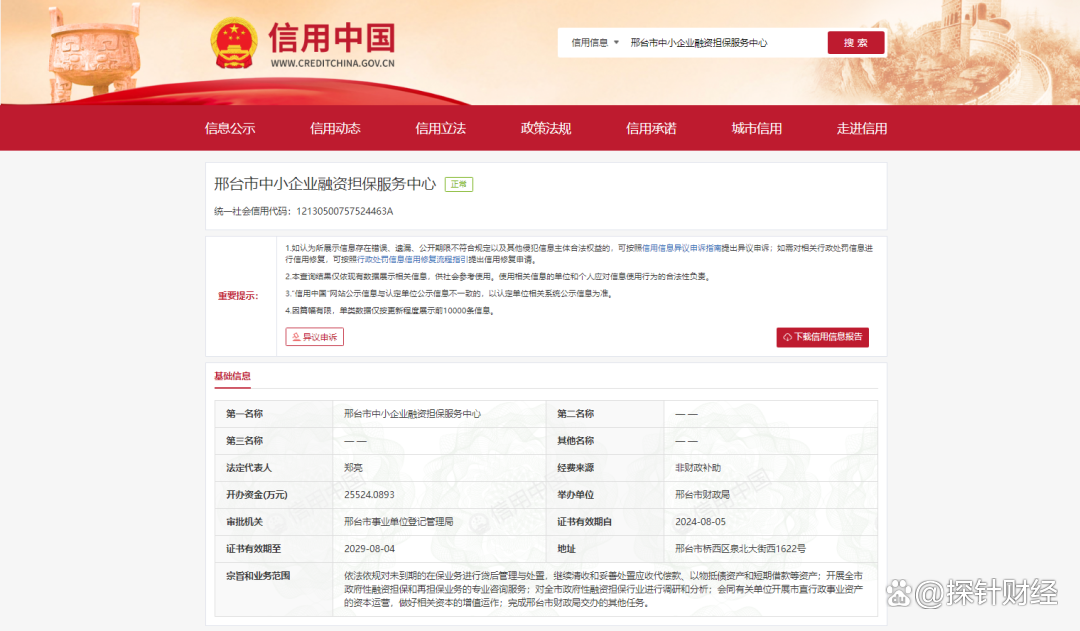 公开信息显示,邢台中小担保是经邢台市事业单位登记管理局审批设立的事业单位,举办单位为邢台市财政局,法定代表人为郑某,开办资金达25524.0893万元(约2.55亿元),注册地址位于邢台市桥西区泉北大街西1622号。