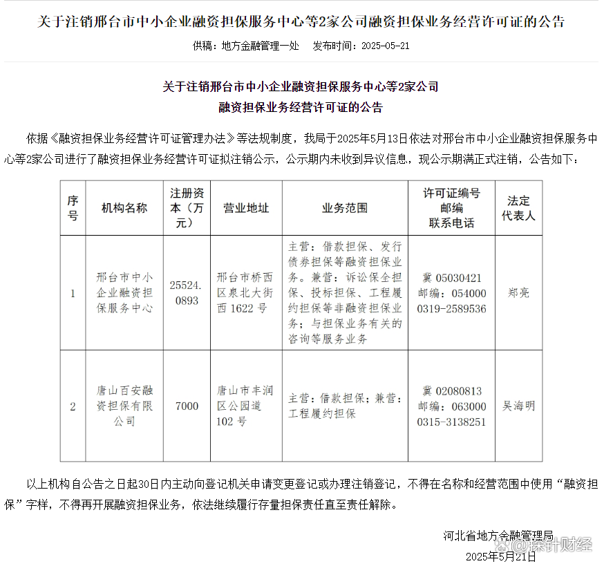 据河北省地方金融监督管理局官网2025年5月21日发布的公告,该局依据《融资担保业务经营许可证管理办法》等相关规定,已于5月13日对邢台中小担保等2家机构启动许可证拟注销公示。公示期内未收到异议,随后正式注销其融资担保业务经营许可证。公告明确要求,相关机构需自公告发布之日起30日内,向登记机关申请变更登记或办理注销登记,不得在名称和经营范围中使用“融资担保”字样,不得再开展融资担保业务,同时需依法履行存量担保责任直至解除。