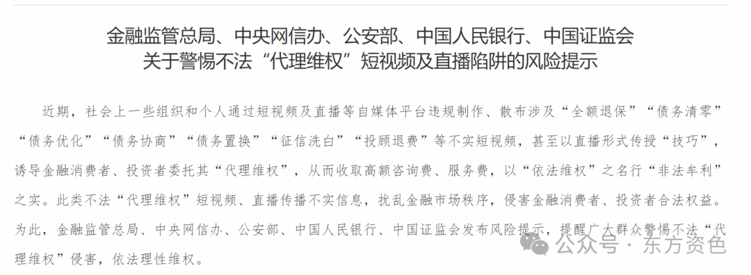此类不法“代理维权”短视频、直播传播不实信息,扰乱金融市场秩序,侵害金融消费者、投资者合法权益。为此,金融监管总局、中央网信办、公安部、中国人民银行、中国证监会发布风险提示,提醒广大群众警惕不法“代理维权”侵害,依法理性维权。