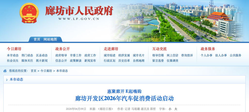 4月1日至6月30日,廊坊开发区组织开展“惠聚廊开,E起嗨购”2026年汽车促消费活动,鼓励汽车生产和销售企业加大优惠力度,提振消费者信心,助力汽车消费升级。