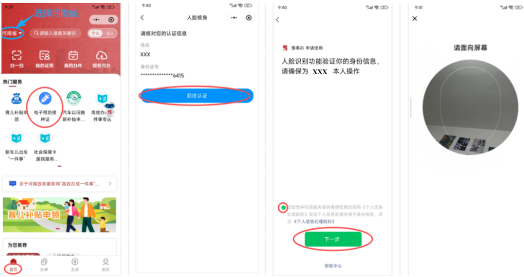 第一步:进入平台。微信搜索“豫事办”小程序,或下载“豫事办”App(限iOS/鸿蒙系统)。首页左上角切换地区为“河南省”,找到并点击“电子预防接种证”入口,选择“前往认证”。
