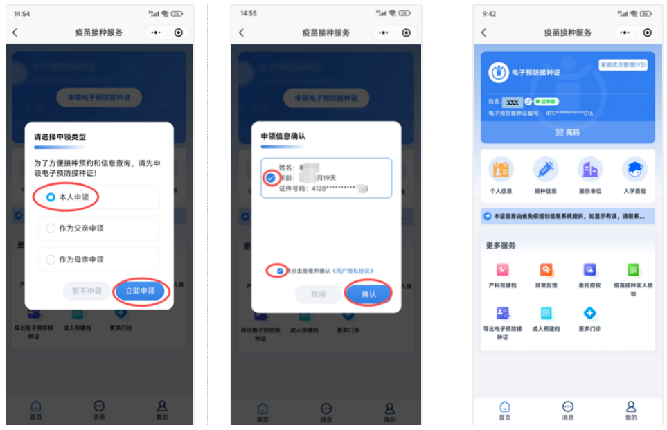 (1)自己(或儿童监护人)申领。点击“申领电子预防接种证” → 选择“本人申领” → 确认个人信息 → 勾选隐私协议 → 下一步 → 完成!