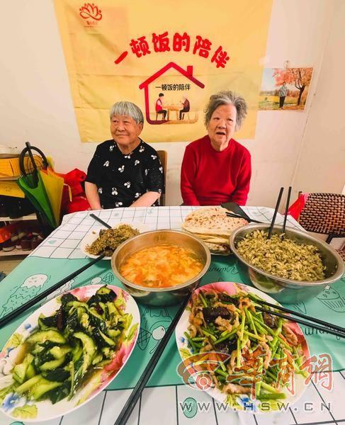 临近中午,西安市莲湖区西关街道解家村社区新街坊小区的院子里飘出了饭菜香。蒜薹炒肉、槐花麦饭、香椿炒鸡蛋、西红柿鸡蛋汤……82岁的独居老人任桂莲的家里,一道道热乎可口的菜陆续上桌,氤氲的热气中,任桂莲和她86岁的老闺蜜曾玉凤以及社区副书记胡爱群、几位志愿者围坐在一起,他们吃着、聊着、笑着。