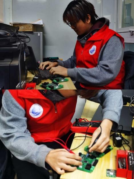 「图为郑嘉琦在艾默斯公司调试机器人电路板 郑嘉琦供图」