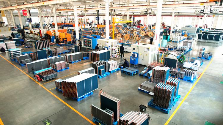 在三河同飞制冷股份有限公司精密制造车间,工人正在生产换热器产品。马俊庭摄