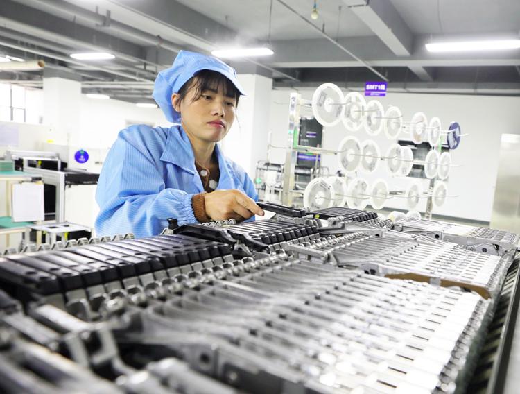 在汉旗集成电路(固安)有限公司生产车间,工人正在准备电子元件。肖靖凯摄