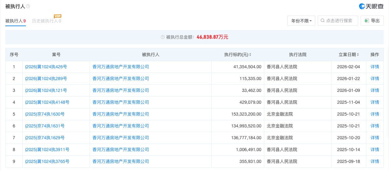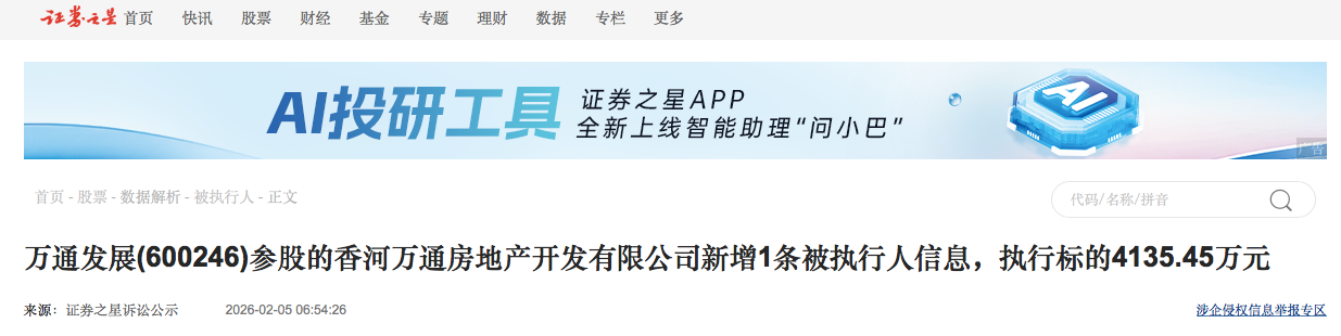 证券之星消息,根据天眼查-司法案件数据整理,2月3日万通发展(600246)参股的香河万通房地产开发有限公司新增1条被执行人信息,执行标的4135.45万元。被执行人信息如下: