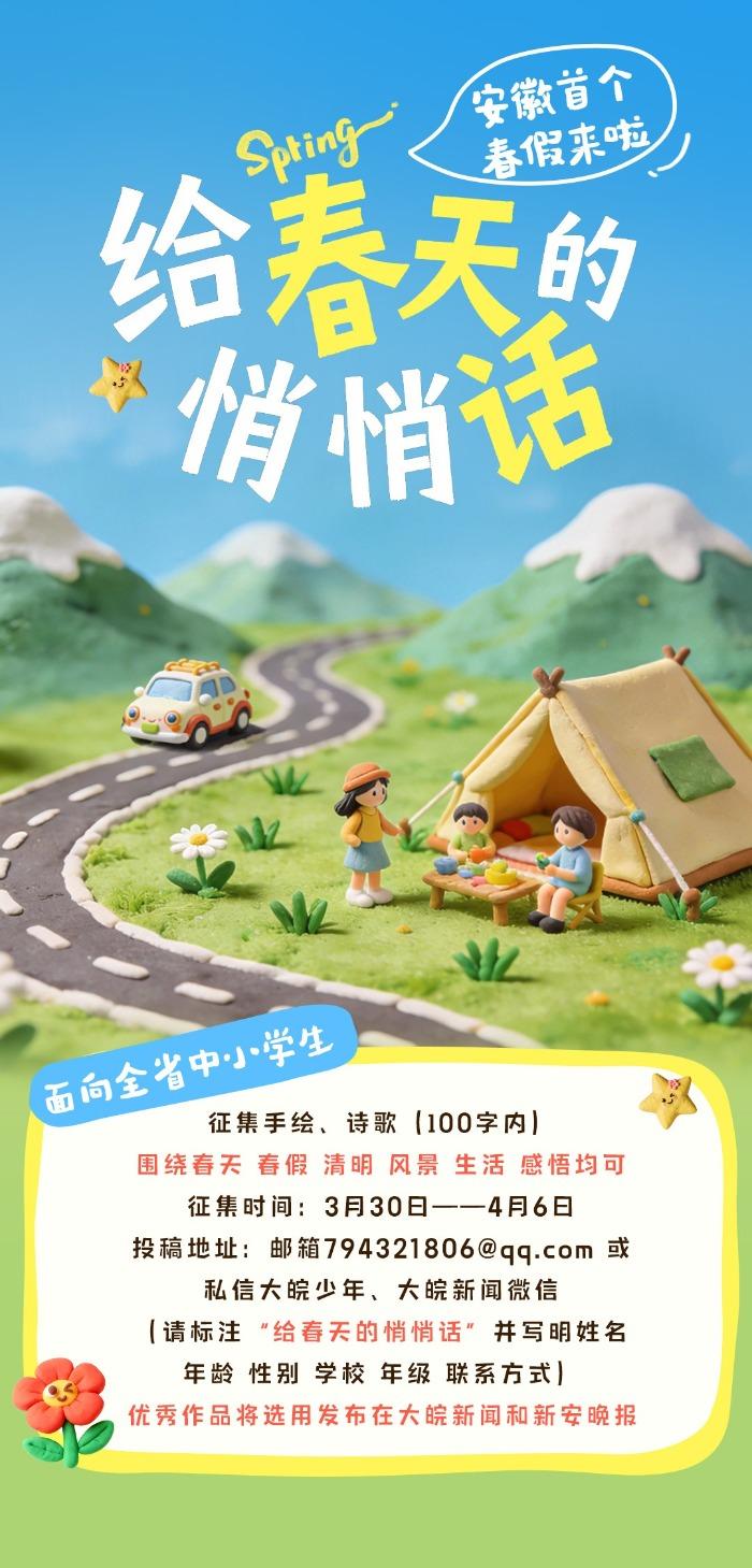 根据安排,安徽首个春假于4月1日至3日与清明假期连休,形成6天小长假。大皖新闻“给春天的悄悄话”征集将持续到4月6日。这个春天,我们不做“卷”王,只做春天的倾听者。期待更多孩子拿起画笔、写下诗句,把藏在心里的春天,说给我们听。