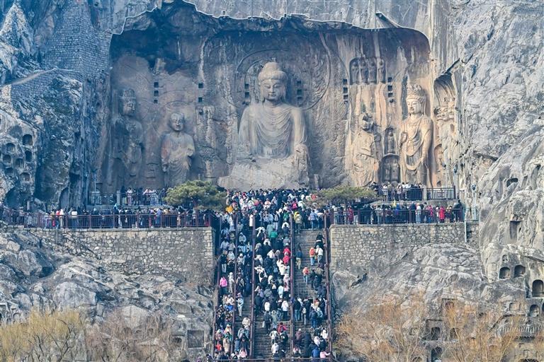 众多游客来到洛阳龙门石窟景区领略千年石刻造像艺术的独特魅力。(资料图)