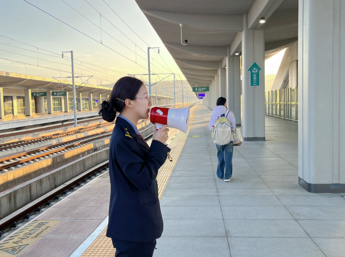 遇到旅客迷路,她“我来送您”;遇到老人不会操作,她“我来教您”;遇到突发状况,她“我来处理”。这声应答,在潮南站的清晨黄昏响起,成为旅客心中最安心的声音。