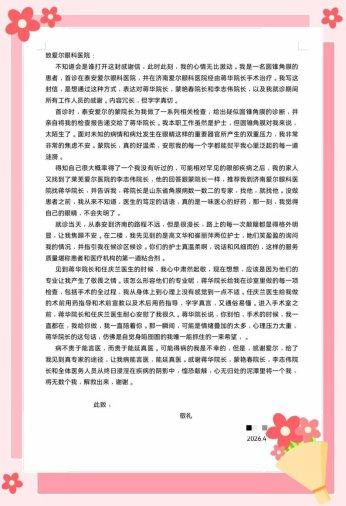 鲁网4月17日讯“病不贵于能言医,而贵于能延真医。”近日,一封感谢信传到泰安光明爱尔眼科医院,字里行间满是患者的真诚谢意。从泰安爱尔首诊确诊,到山东爱尔专家联合会诊,再到顺利完成角膜交联手术,一场顺畅的诊疗接力,不仅为患者稳住了视力,也展现了爱尔眼科医院集团便捷的转诊协作服务。