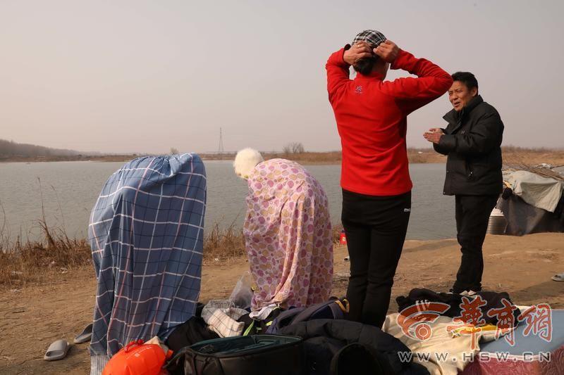 五六分钟后,泳士们陆续折返上岸,皮肤透着红晕。他们迅速用自己携带的温水简单的冲洗一下,便穿上棉衣。